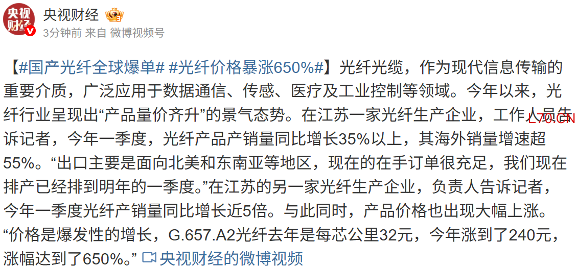 国产光纤全球爆单 部分产品价格暴涨650%