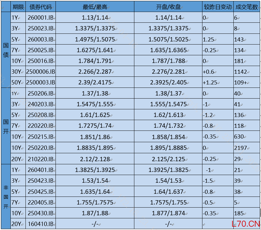 今日公司债企业债交投一般,收益变动不大,需求集中在2-5年AAA品种,收盘成交在估值附近。银行债交投活跃,收益变动不大,收盘成交在估值附近。