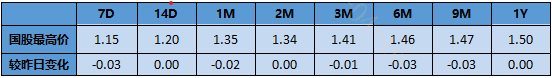 今日存单成交清淡。全期限来看国股即期收益率,6月底1.35%,10月底1.44%,1月底1.47%,足年1.4775%。