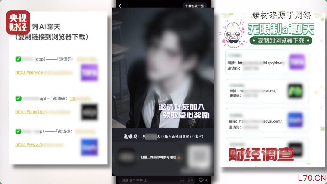 同样,记者在某短视频平台上搜索“AI聊天软件推荐”,在搜索结果中也看到,各种分享推广的热聊帖子,在帖子主页以及评论区中,老用户们互相分享、推荐自己喜欢的AI聊天软件,并同时邀请新用户进入分享群。