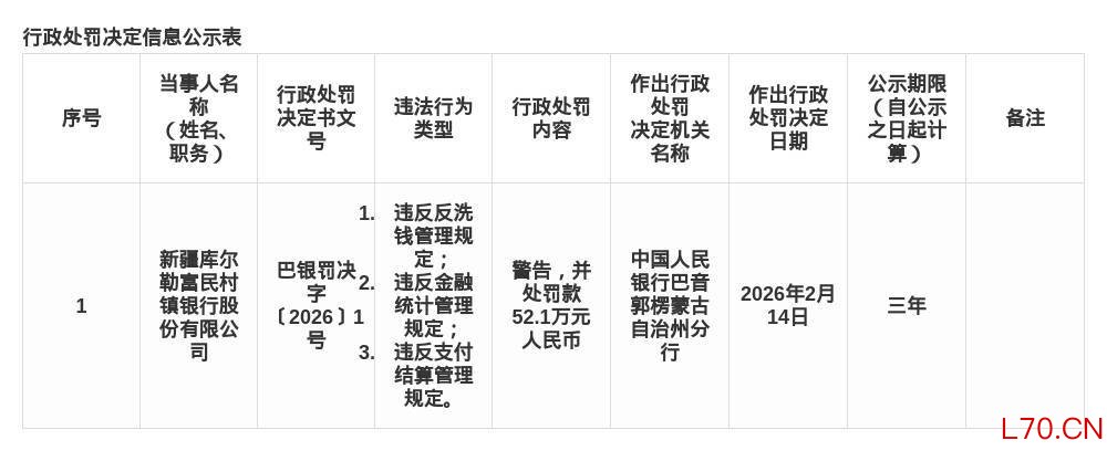 新疆库尔勒富民村镇银行被罚52.1万,涉违反反洗钱等管理规定
