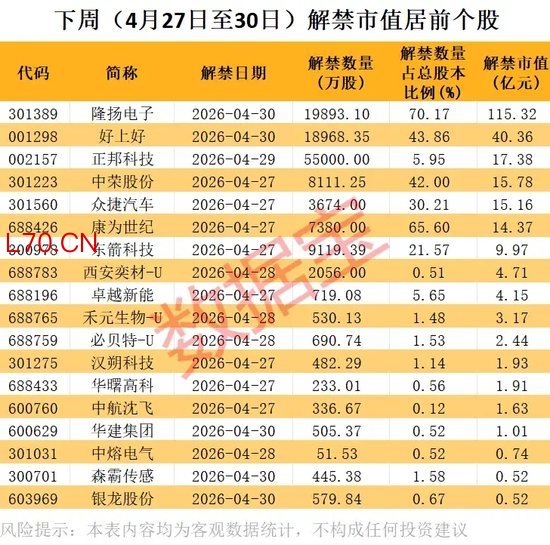 据证券时报·数据宝统计,下周(4月27日—30日)A股将有24股解禁,合计解禁数量约12.96亿股,以最新收盘价计算,总解禁市值达252.25亿元,解禁压力主要集中在电子、医药生物、汽车等领域。